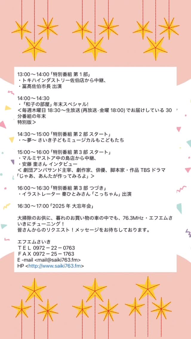 - 【開局15周年記念特別番組 ありがとう!】 いつもエフエムさいきを聴いていただきありがとうございます。 エフエムさいきはおかげさまで2025年12月30日に開局15周年を迎えます。 佐伯市のみなさまへ、感謝の気持ちを込めて「エフエムさいき開局15周年特別番組」をお届けします! 12月30日(火)13時スタート!