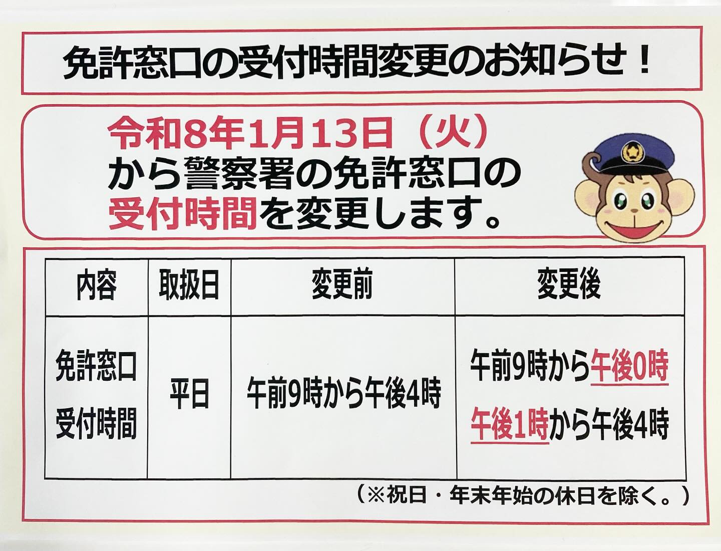 令和8年1月13日(火)より、警察署および運転免許センターの受付時間が変更となっています。